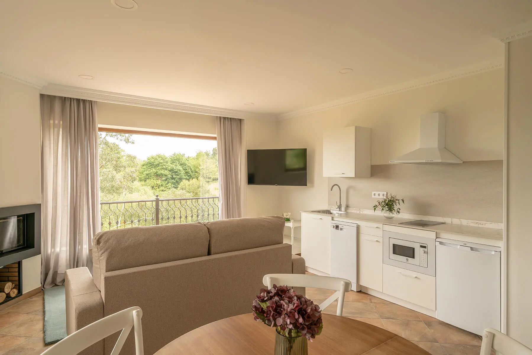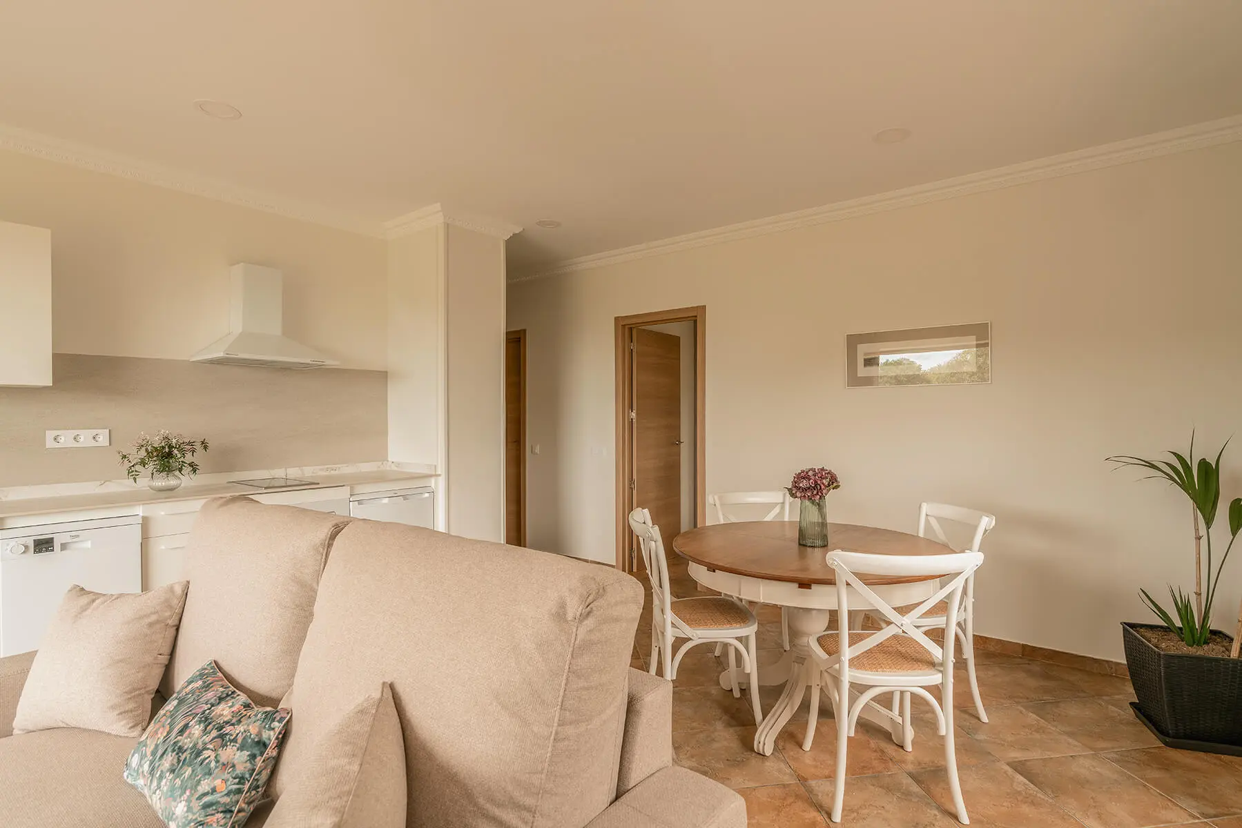 Apartamento de 55 m² amplio y luminoso en plena naturaleza para compartir sin perder comodidad. Es ideal para 3 personas, dispone de dormitorio con cama doble (1,50 m) y baño privado, además de un salón-comedor acogedor con sofá cama (1,40 m) y una cocina independiente completamente equipada.