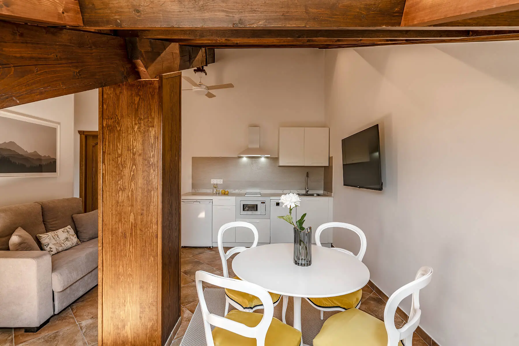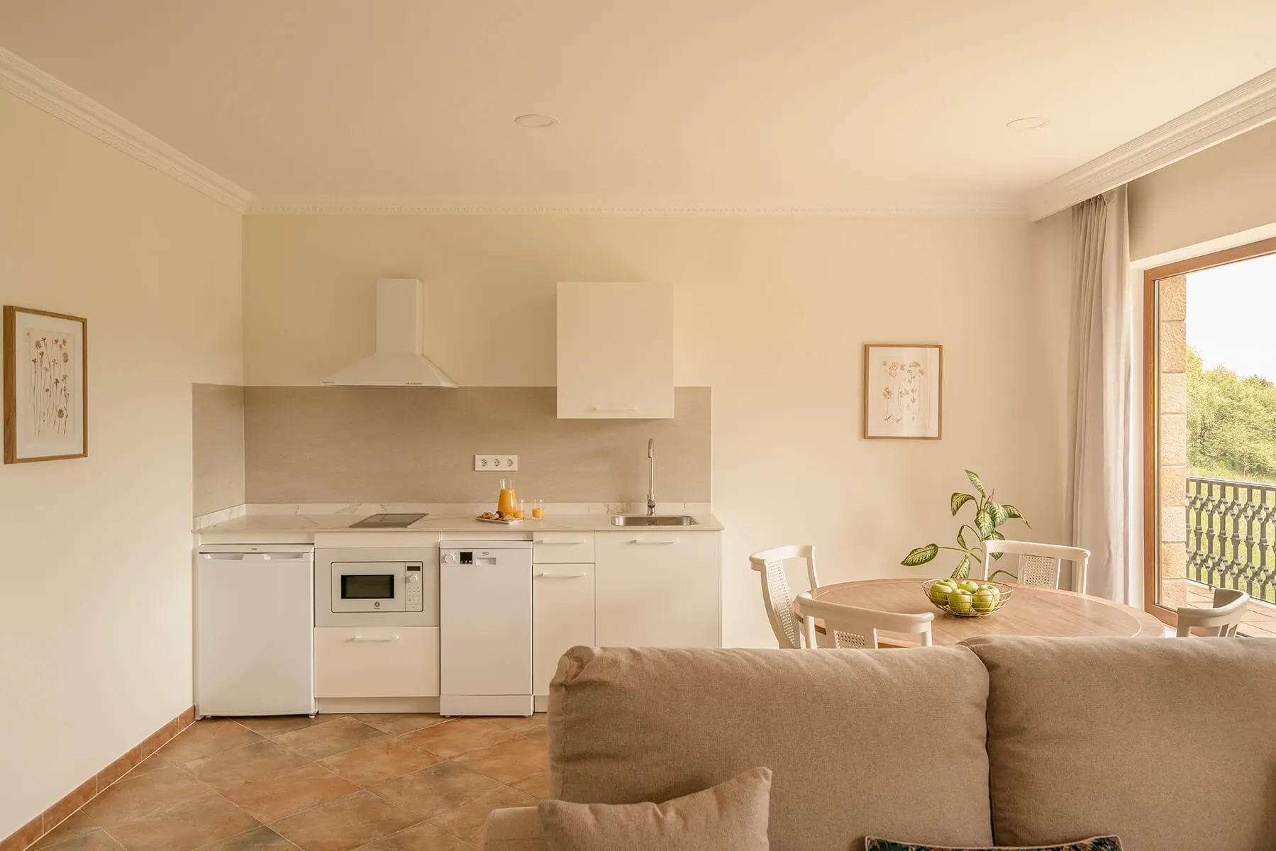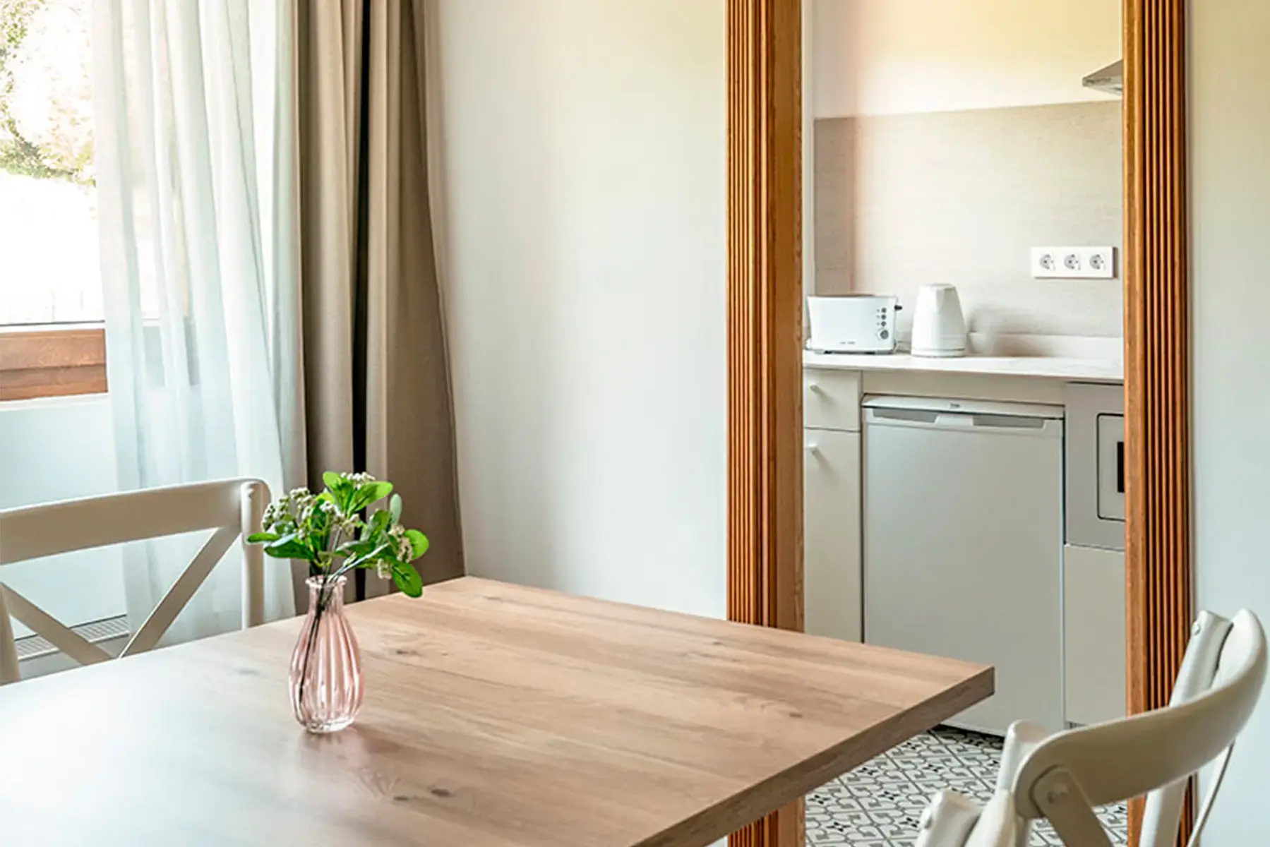 Este apartamento de 53 m² para 3 personas combina calidez, amplitud y luz natural en un entorno tranquilo. El salón-comedor, con un gran ventanal, ofrece vistas al paisaje verde y cuenta con sofá cama de 1,40 m y chimenea de leña para los días más relajados. La cocina está integrada y equipada con lo necesario para preparar cualquier comida con comodidad.